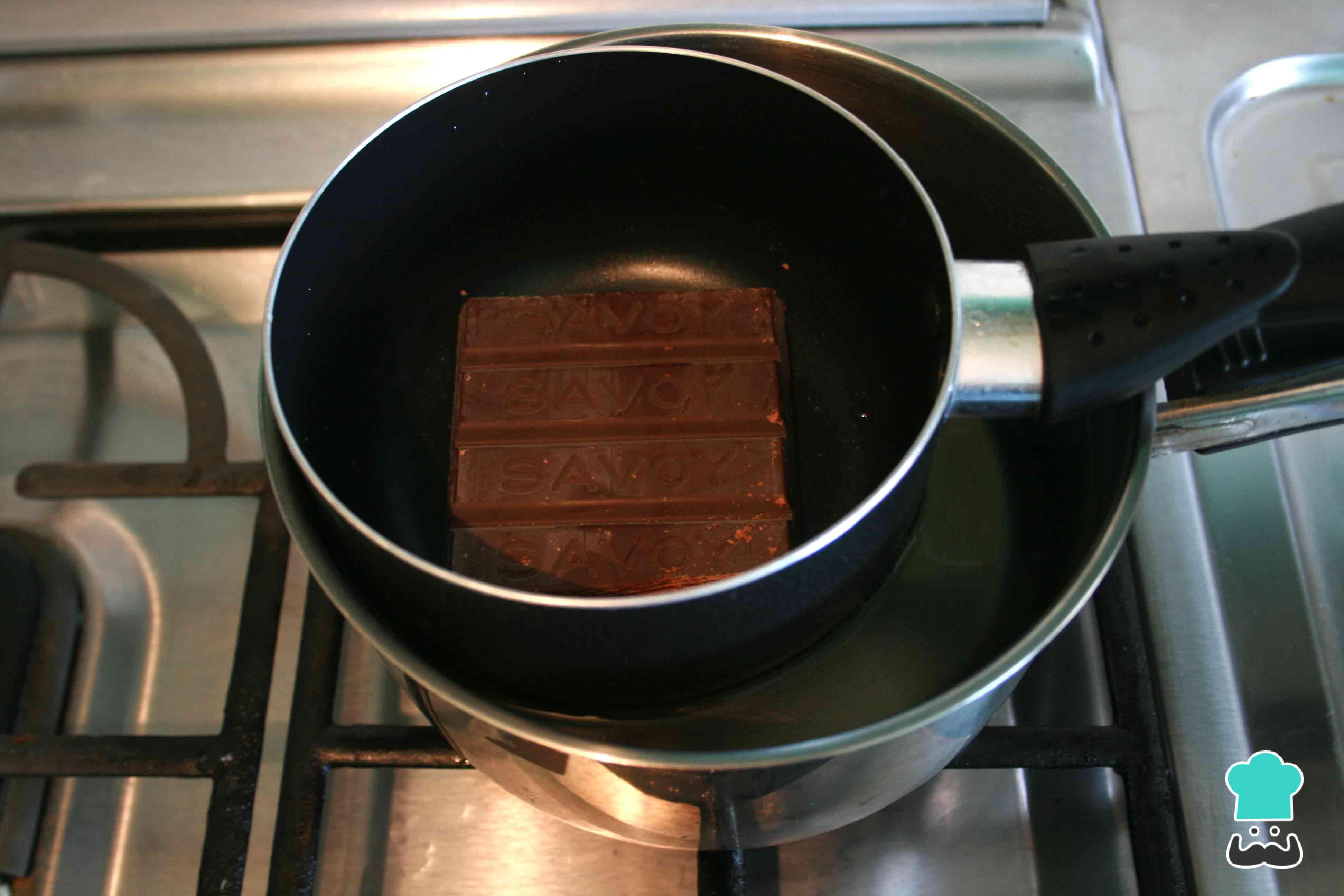Utiliza una cacerola grande y otra pequeña para preparar el baño María. Vierte en la cacerola grande agua que cubra 3/4 partes de la cacerola pequeña. Deposita el chocolate dentro de la olla pequeña y espera hasta que se derrita. En ese momento vierte la vainilla y mezcla. Retira la cacerola del fuego y deja refrescar el chocolate a temperatura ambiente.