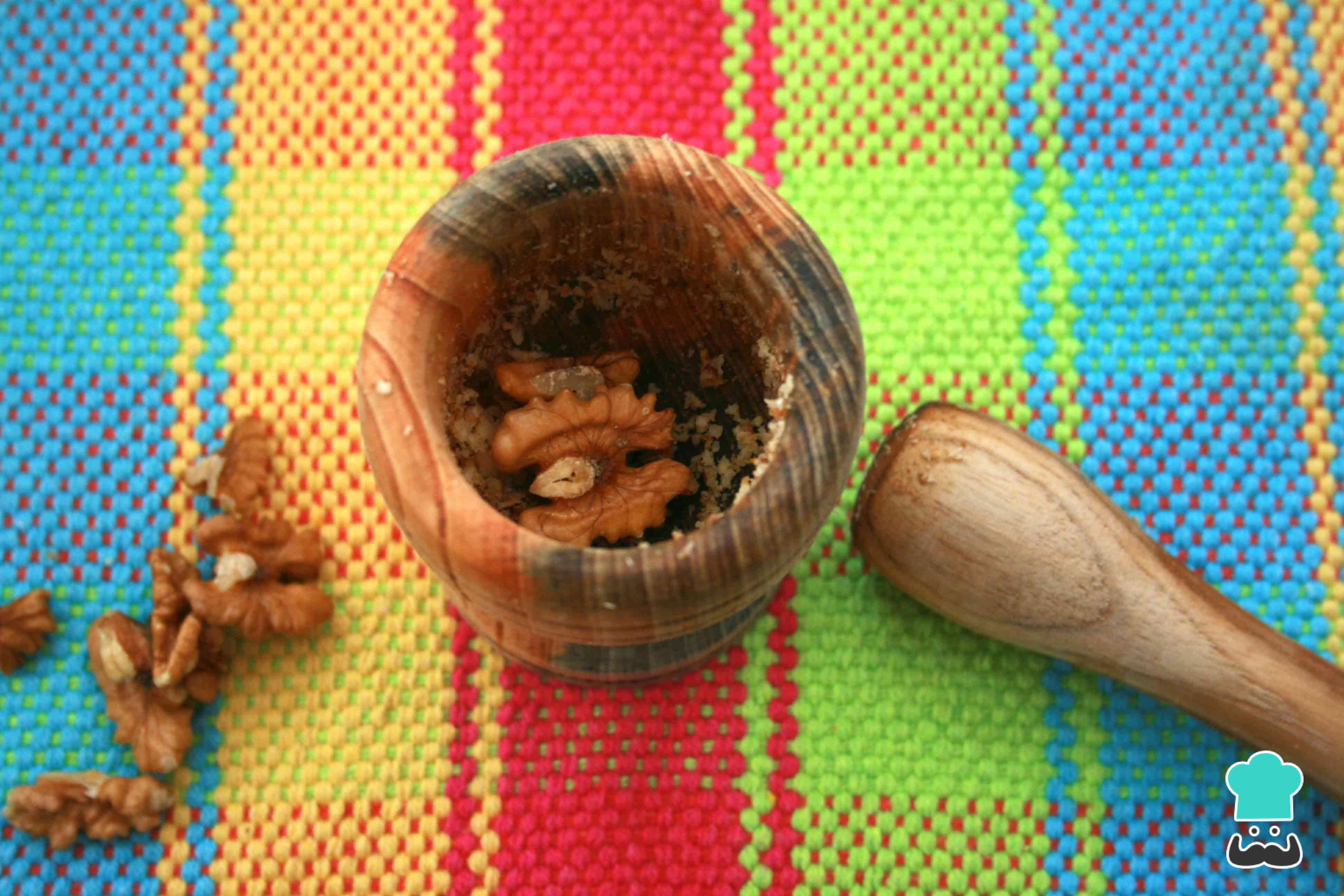 Utiliza el mortero para triturar las nueces y reserva. La fuerza que apliques o la repeticiones al machacar dependen de que textura deseas para la cubierta de las trufas de aguacate y chocolate. ¿Prefieres algo parecido a una harina o trozos más consistentes?