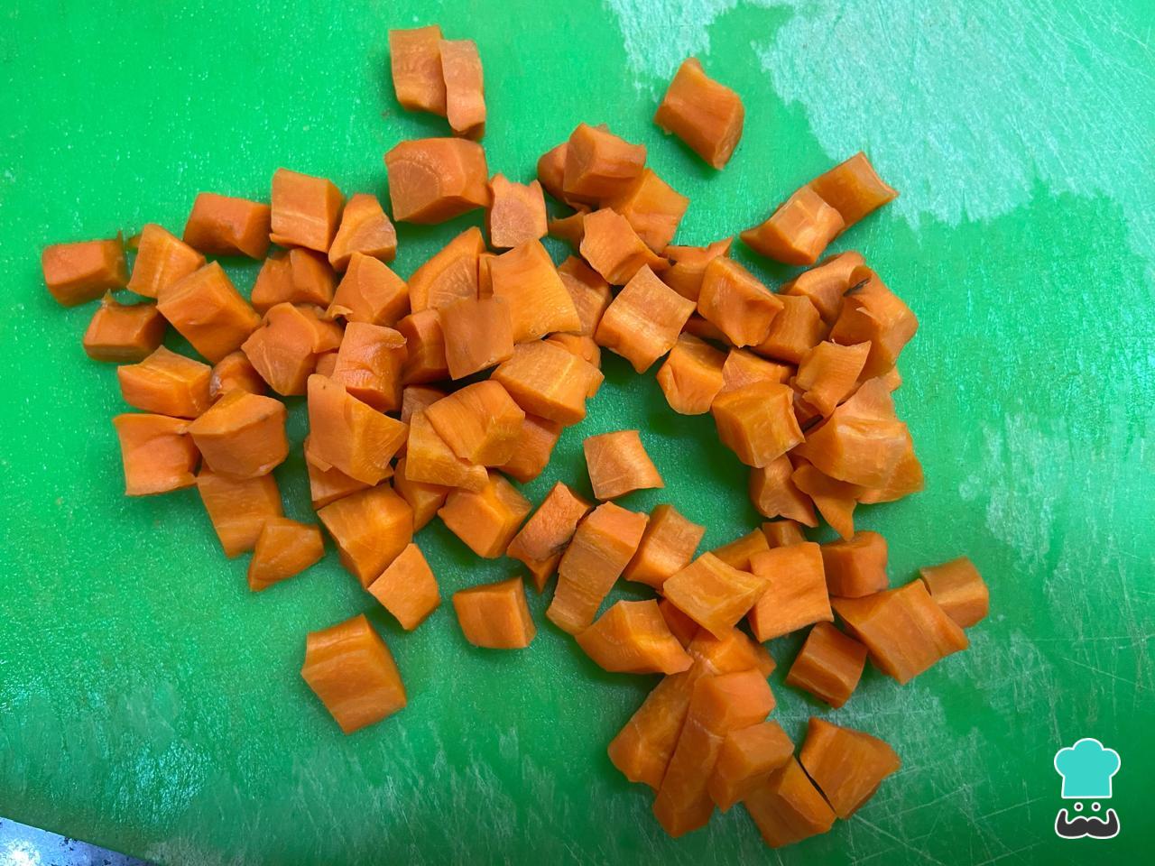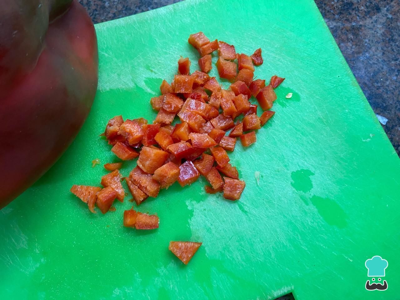 Lava el pimiento rojo, retira las semillas y corta también en cubos.