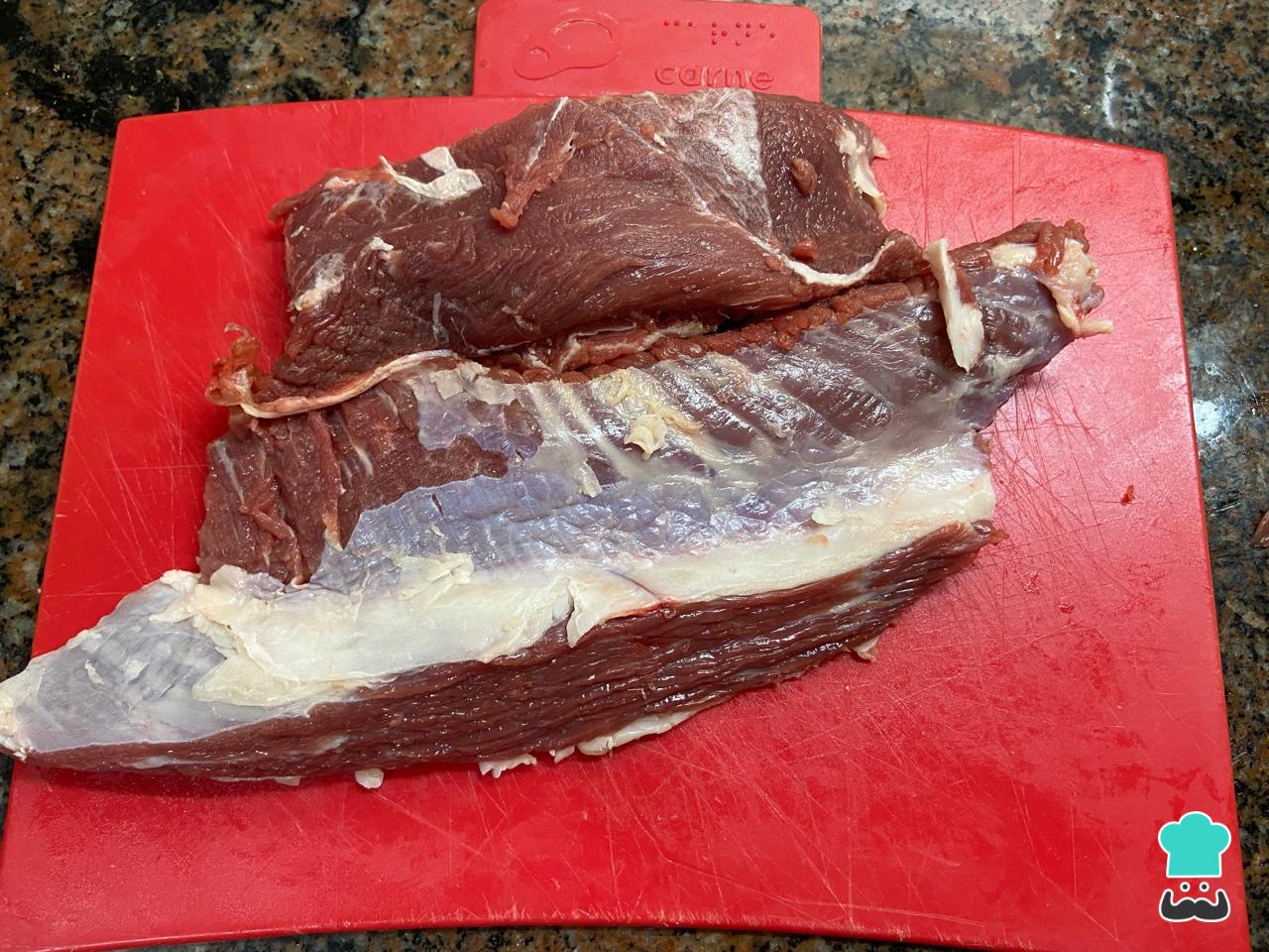 Retira la grasa exterior del vacío. Según prefieras, puedes dejarlo en una sola pieza o cortarlo en porciones.
