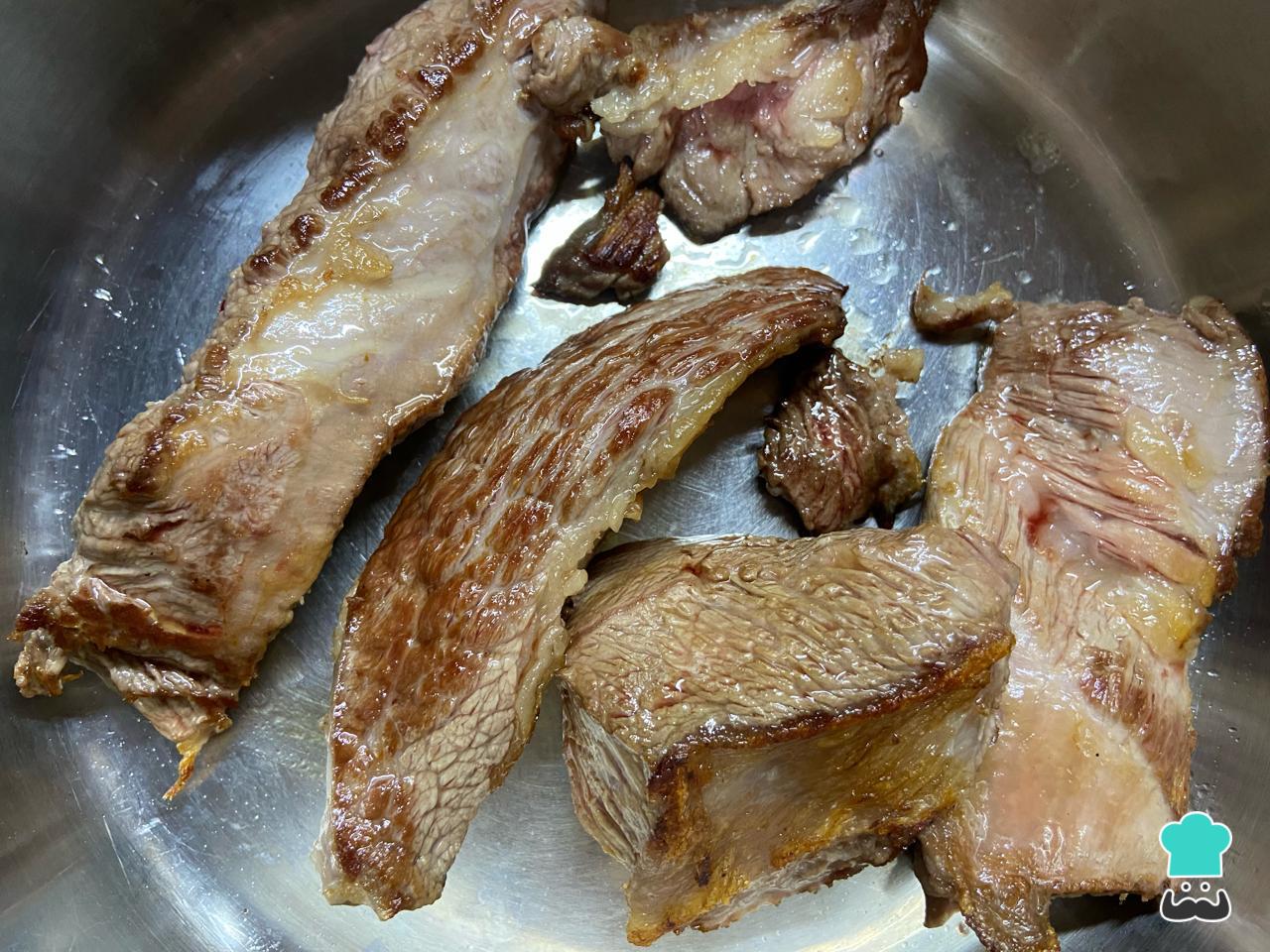 Calienta en la hornalla una olla con una cucharada de aceite y sella la carne. A continuación, gira para que quede dorada de todos lados.