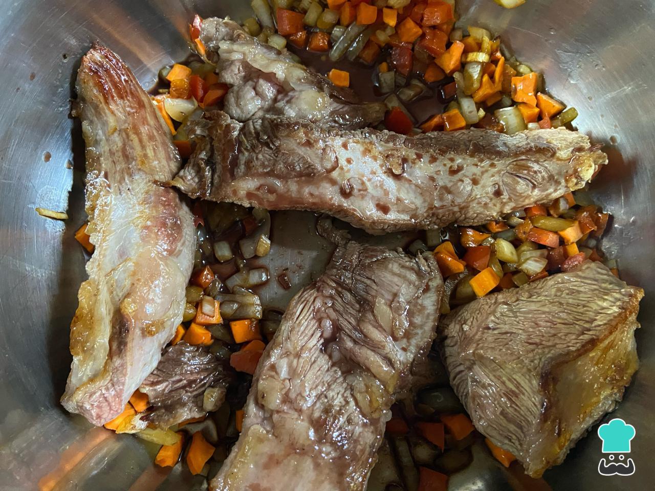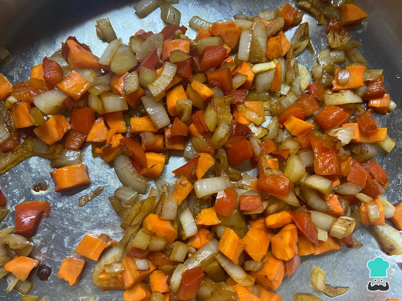 Cuando esté dorada, retira la carne y reserva. Añade otra cucharada de aceite a la olla y saltea los vegetales. Primero la cebolla y, cuando se ponga transparente, suma el pimiento y el ajo. Después de algunos minutos, la zanahoria.
