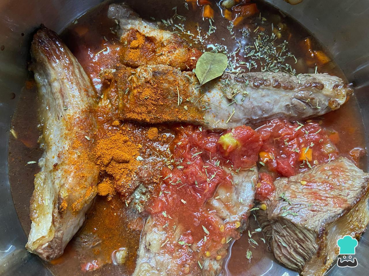 Una vez que se evapore el alcohol, agrega el contenido de la lata de tomate y la hoja de laurel. Condimenta con sal, pimienta y pimentón a gusto.