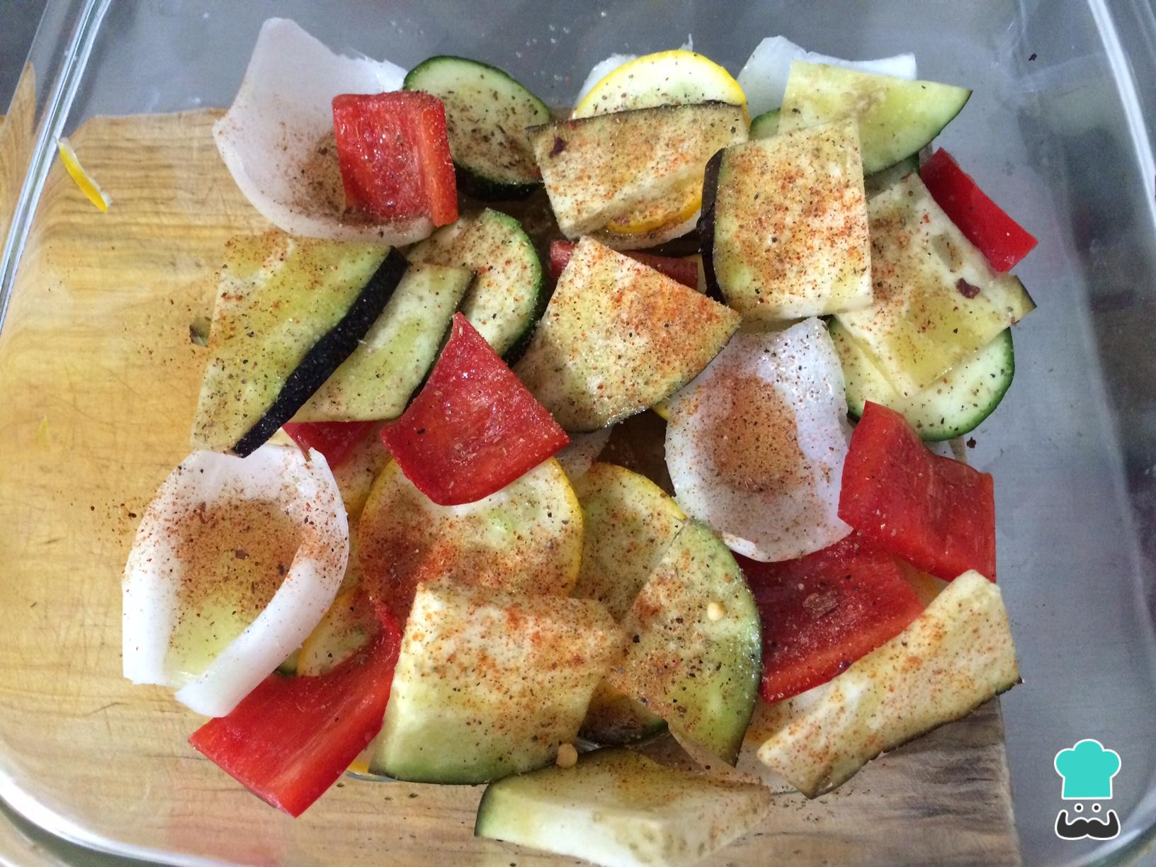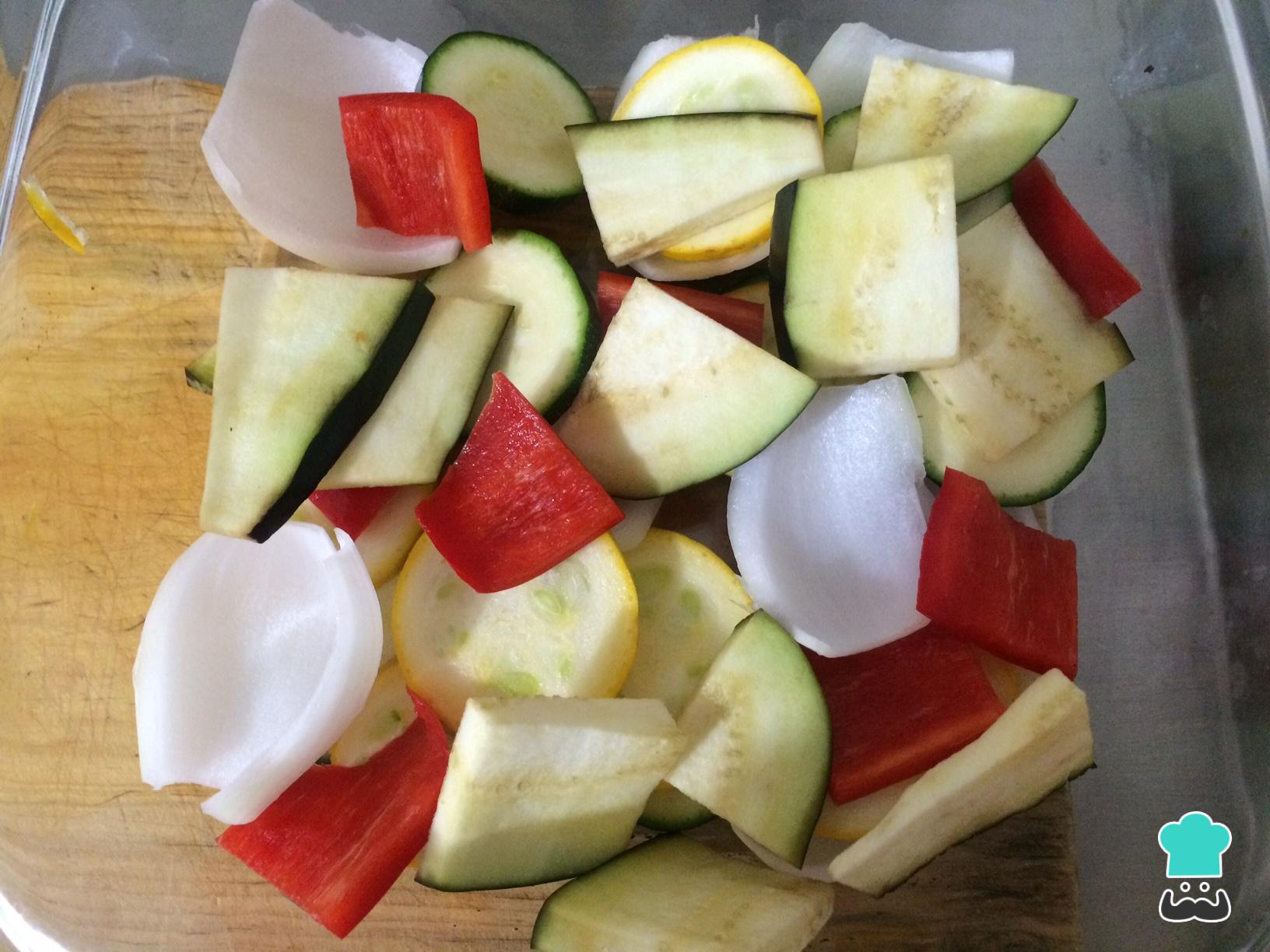 En una refractaria agregar todos los vegetales partidos del mismo tamaño. Te recomiendo trocearlos en cubos pequeños, del tamaño de un bocado más o menos.