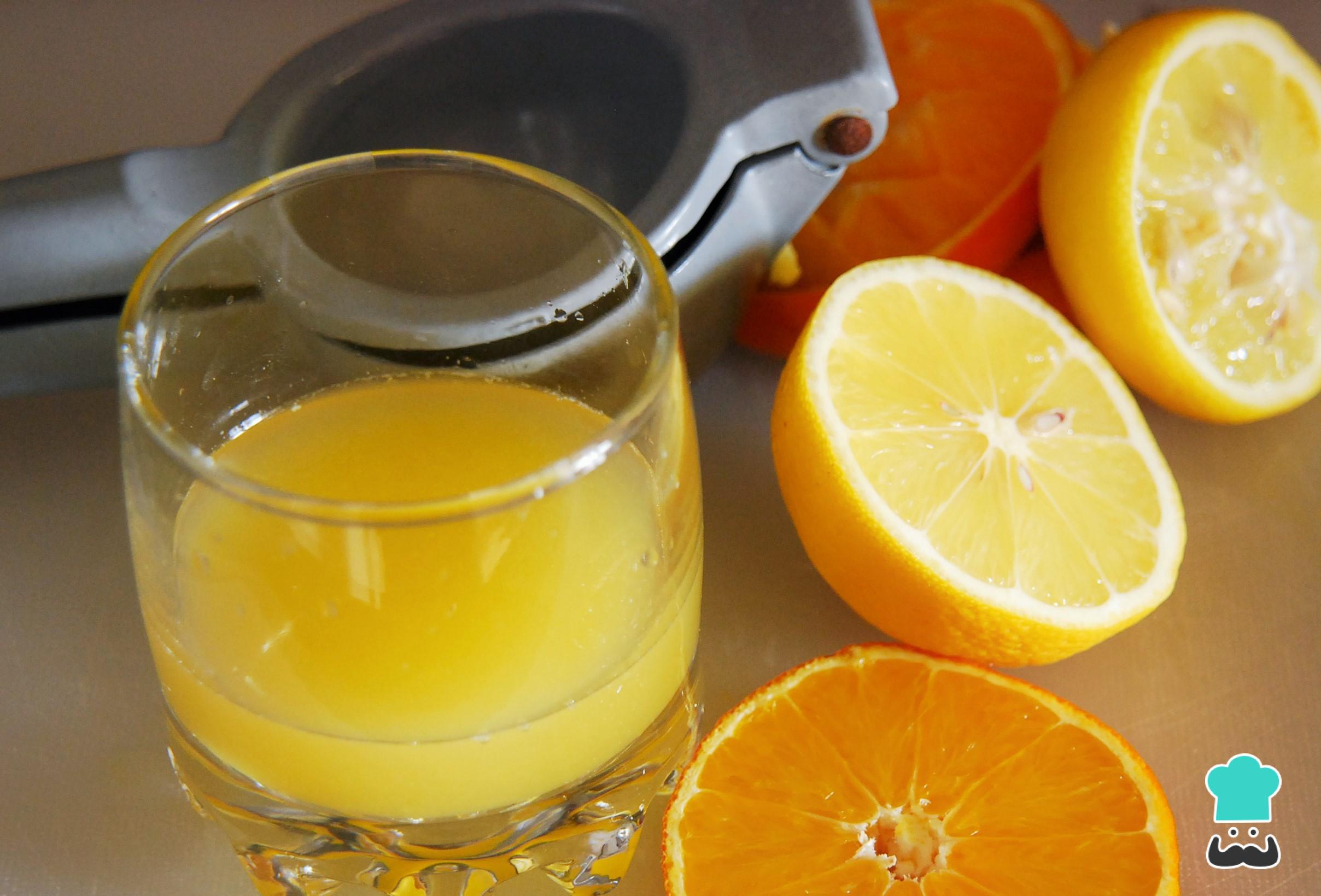 Hacer esta original vinagreta cítrica lo primero que debes hacer es exprimir el zumo de naranja y el de medio limón. No uses una naranja muy grande y procura que no caigan semillas al liquido.