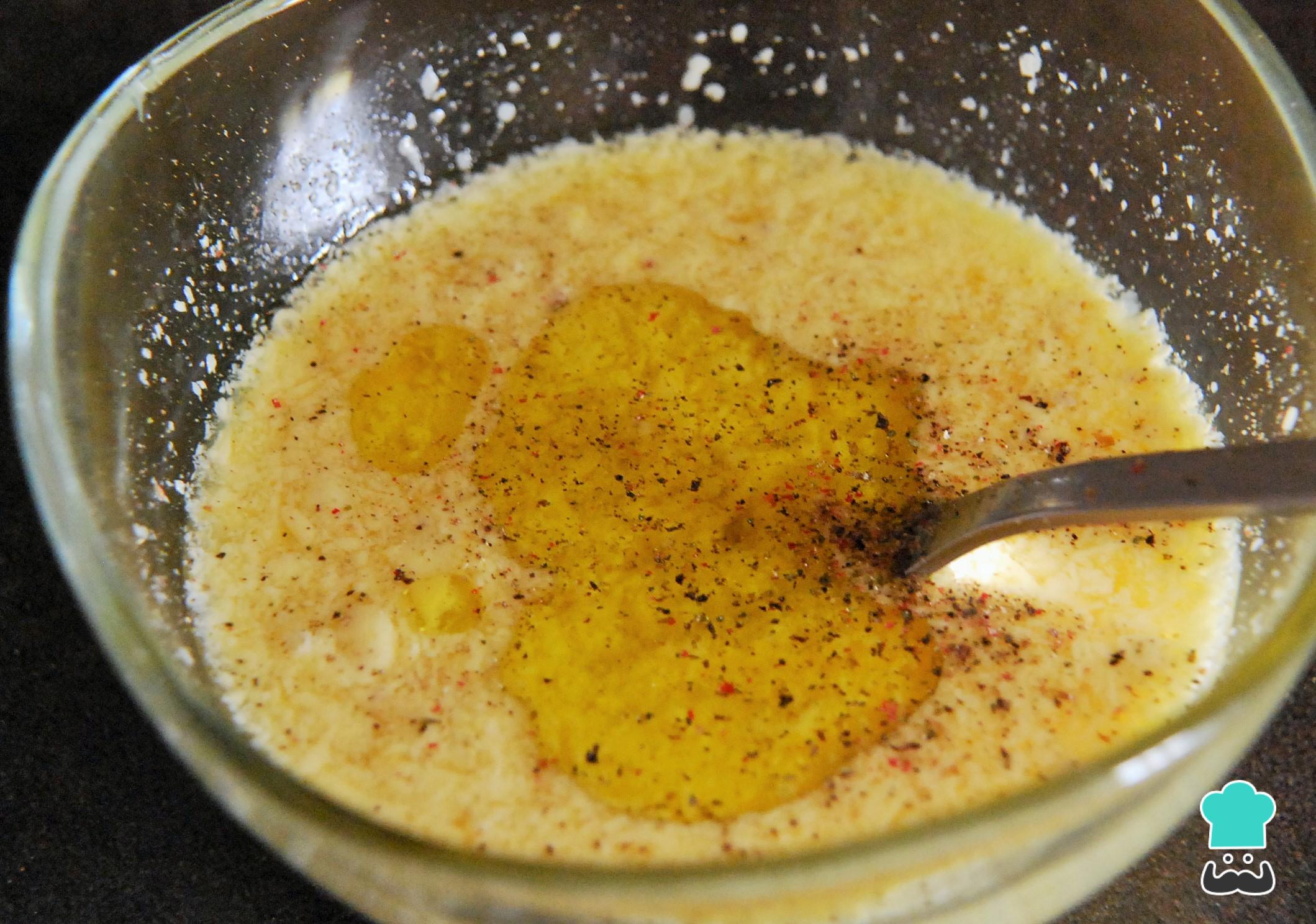 Agrega el resto de ingredientes a la salsa. Yo he utilizado un mix de pimientas, que incluye pimienta rosa entre otras más un toque de sal. También añade un chorrito de aceite y mezcla todo bien.