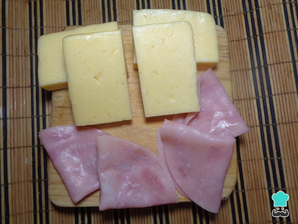 Para comenzar tomamos las dos barras de queso y las partimos en cuatro rectángulos del mismo tamaño cada una, también tomamos las rebanadas de jamón y las doblamos a la mitad y luego nuevamente a la mitad.