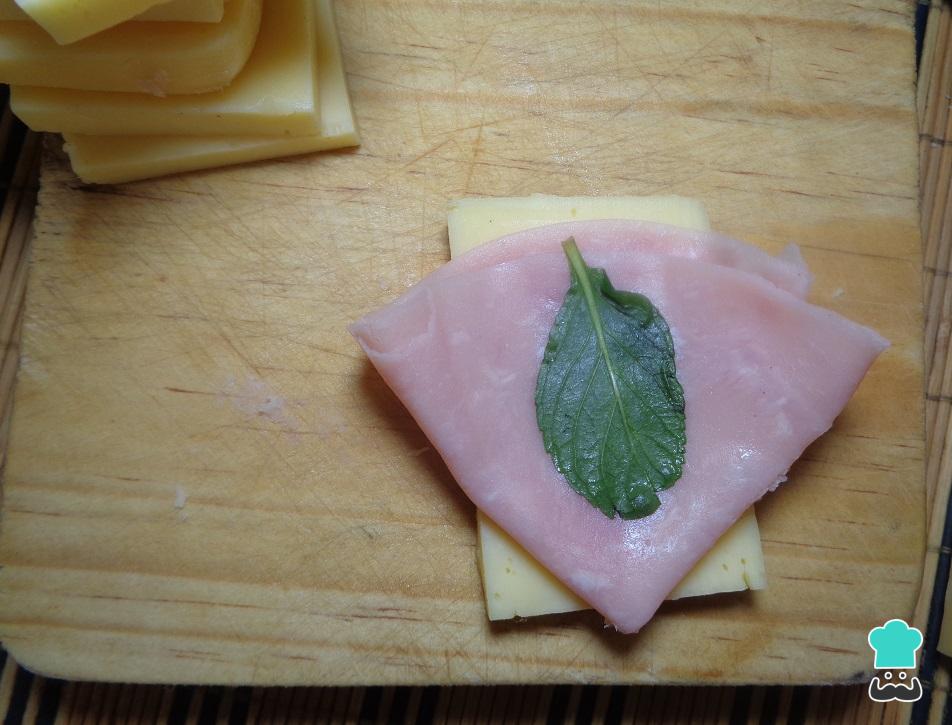 Ahora tomamos uno de los rectángulos de queso y encima colocamos una loncha de jamón, y sobre esta, colocamos una hojita de hierbabuena. Enseguida tomamos otro rectángulo de queso y lo ponemos sobre la hoja de hierbabuena. Nos debe quedar algo parecido a un sándwich formado con los rectángulos de queso.