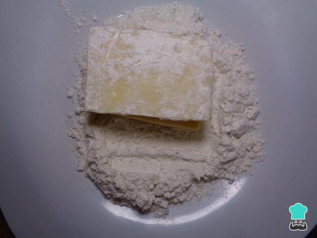Ahora tomamos nuestro pequeño sándwich de queso y lo cubrimos completamente con la harina de trigo.