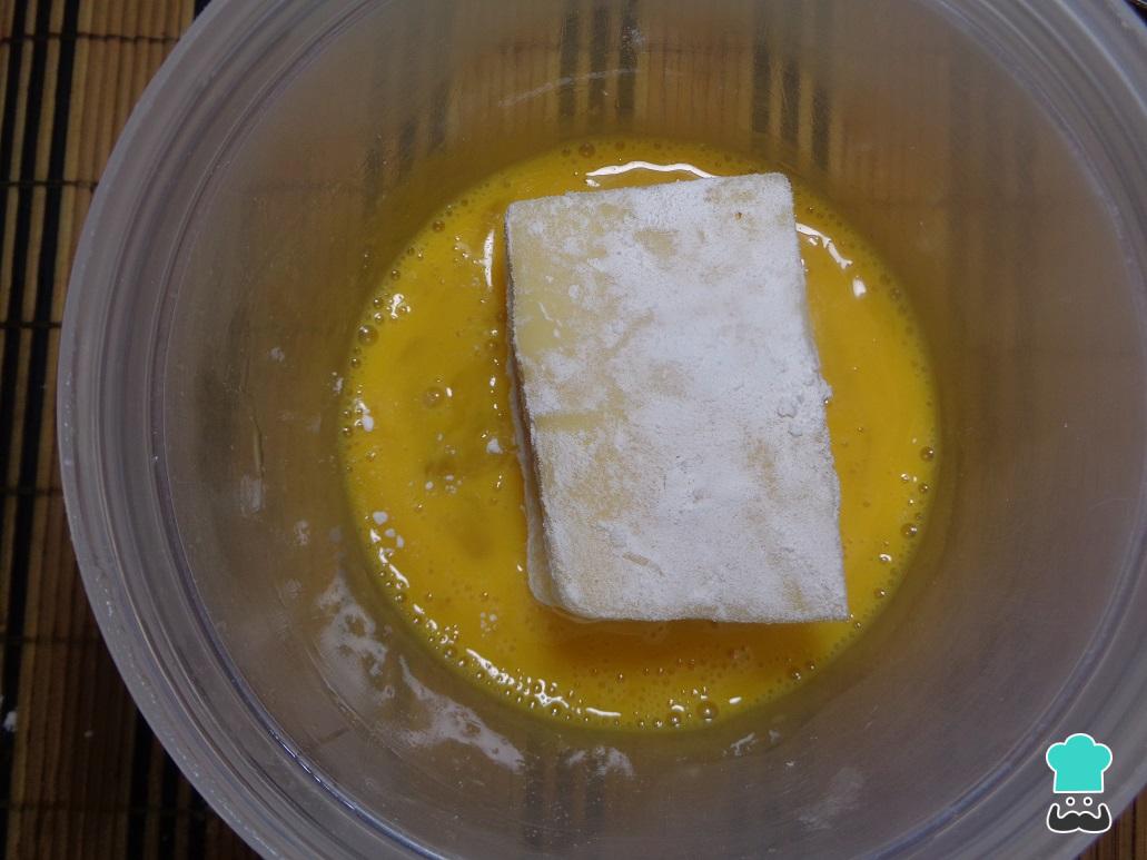 Enseguida lo llevamos al recipiente donde colocamos los huevos batidos y lo bañamos con el huevo.