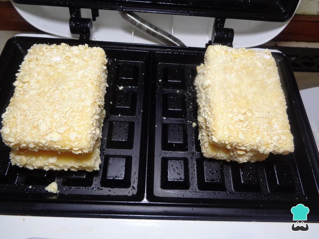Para finalizar los gofres de jamón y queso llevamos a la wafflera y vamos cerrándola poco a poco mientras se va fundiendo el queso. Debemos estar al pendiente ya que no necesitan mucho tiempo de cocción y si nos pasamos el queso se fundirá de más y nuestros waffles salados no adquirirán la forma correspondiente sino que se harán líquidos.