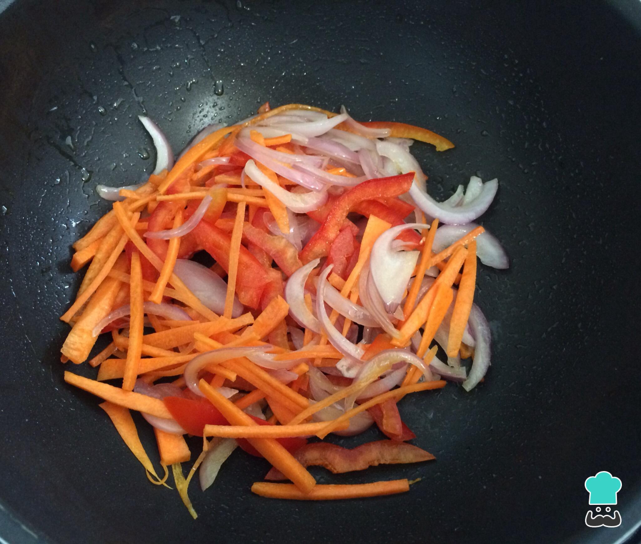 En un wok con aceite, saltear los vegetales mas duros en este caso serian la cebolla, el pimiento rojo y la zanahoria cortadas en tiras delgadas, cocinar hasta que estén doradas.