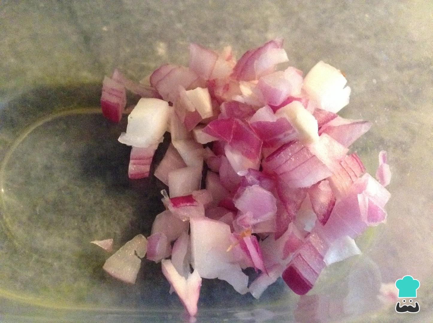 En un bol adicionar la cebolla finamente picada en cuadros. Puedes utilizar cebolla blanca o cebolla morada, la que desees.