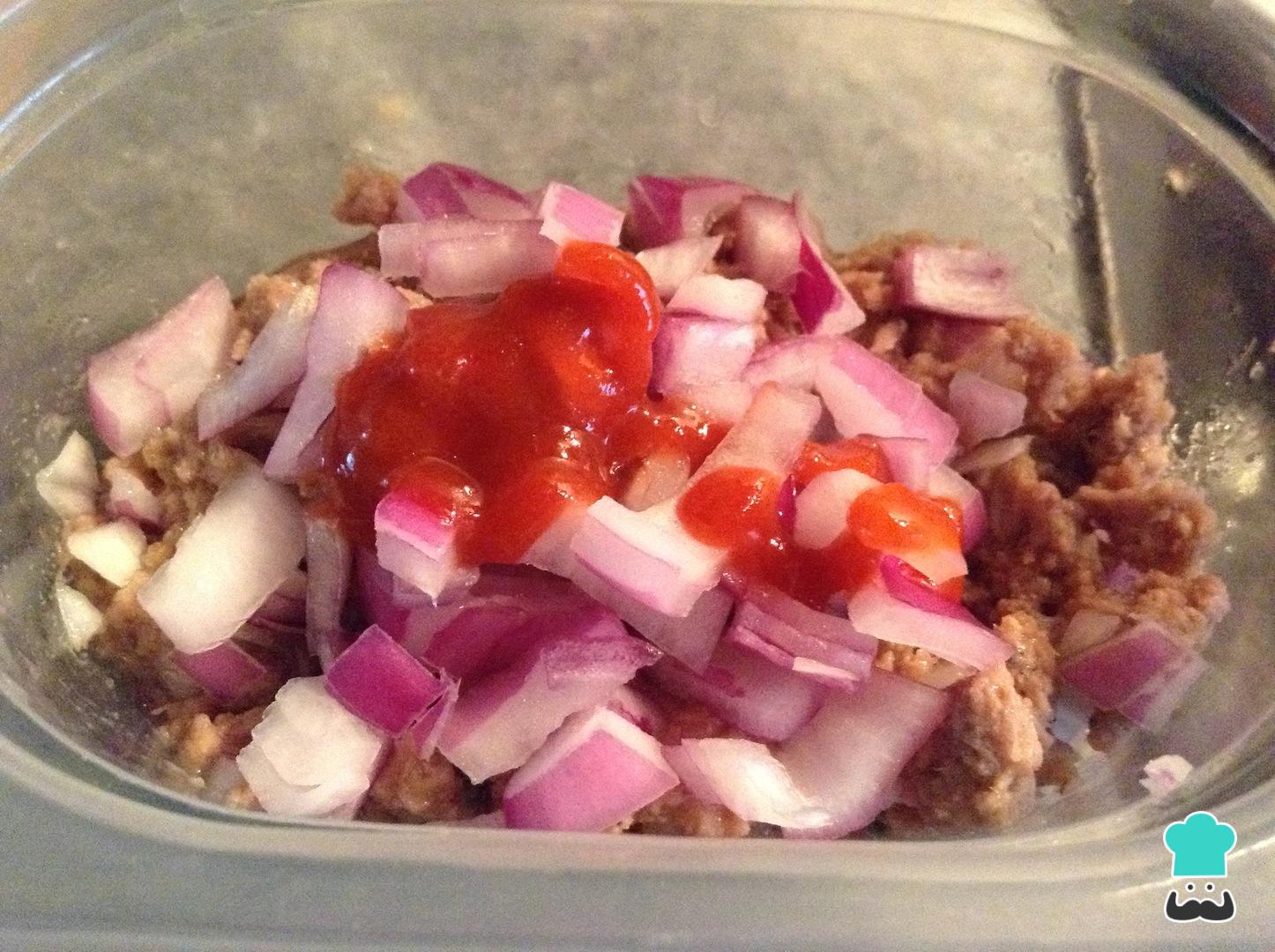 Añade el atún al bol donde tenemos la cebolla morada junto con un poco de sriracha para dar un sabor picante. Si no deseas añadir el picante puedes retirarlo de la receta y sustituirlo por el aliño de tu preferencia.