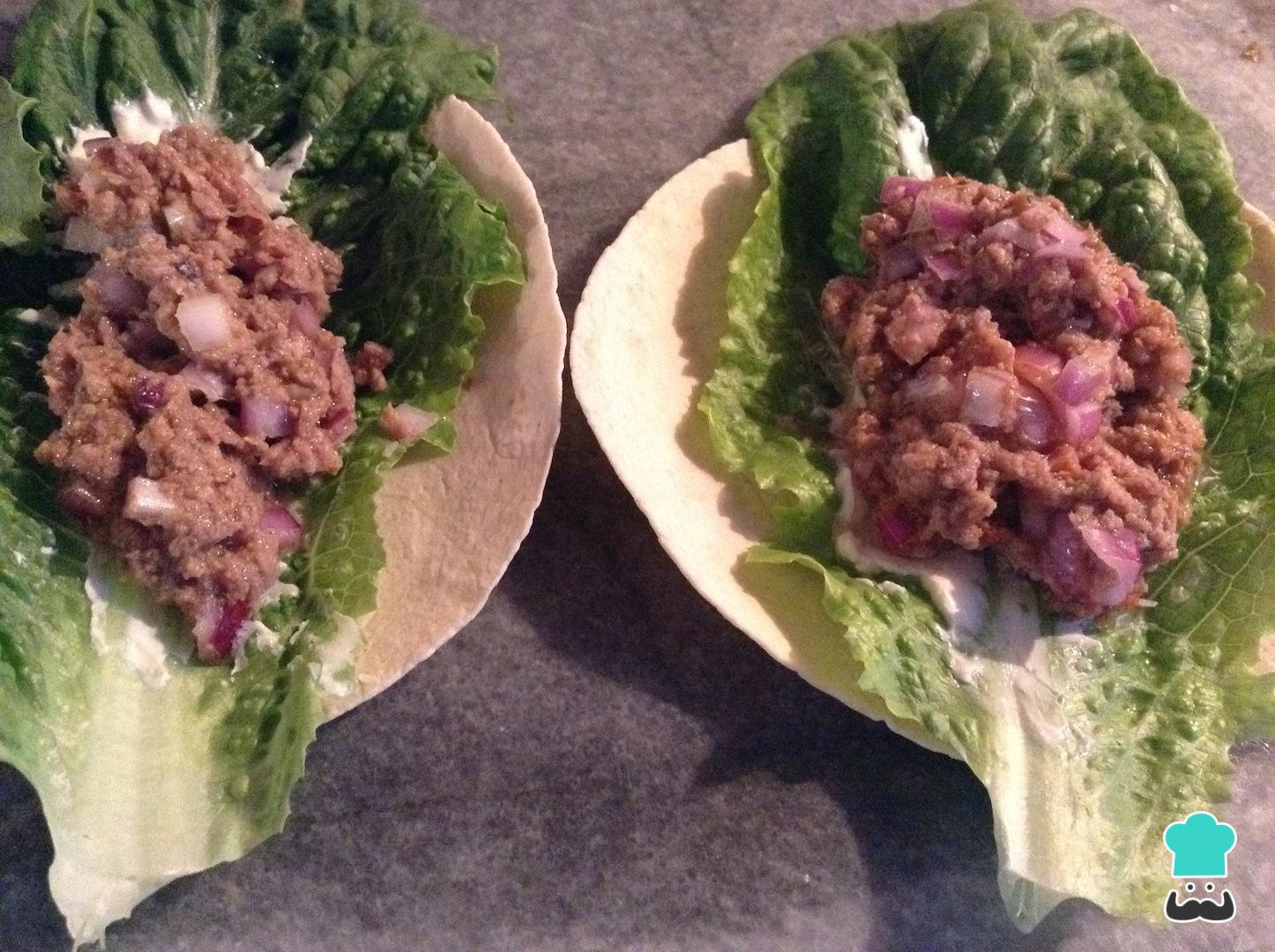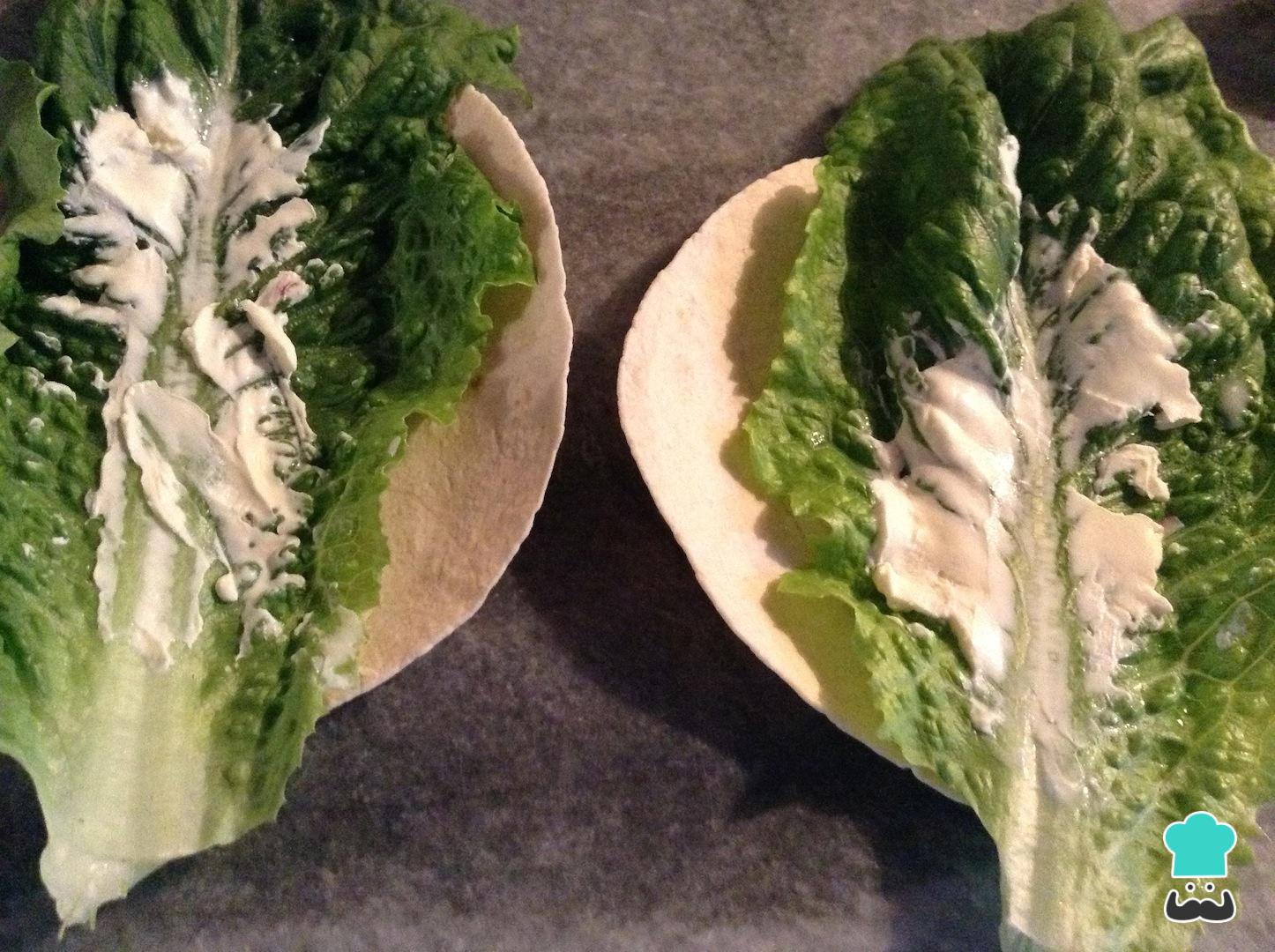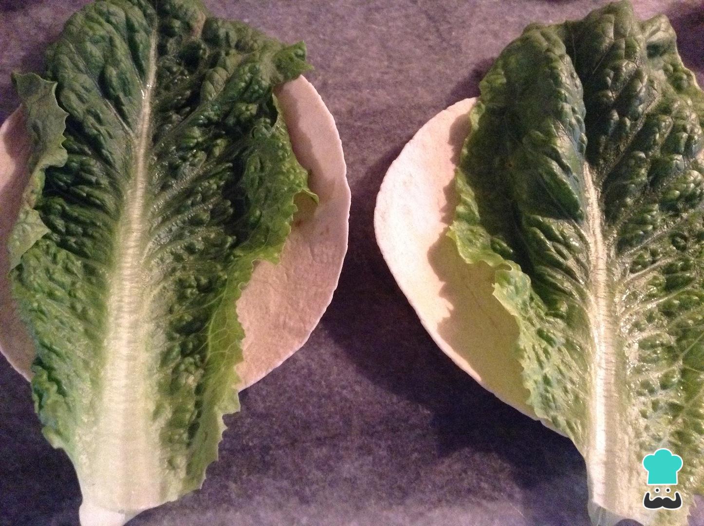 En un mesón o tabla limpia adiciona las tortillas de harina integral y encima de éstas las hojas de lechuga romana.