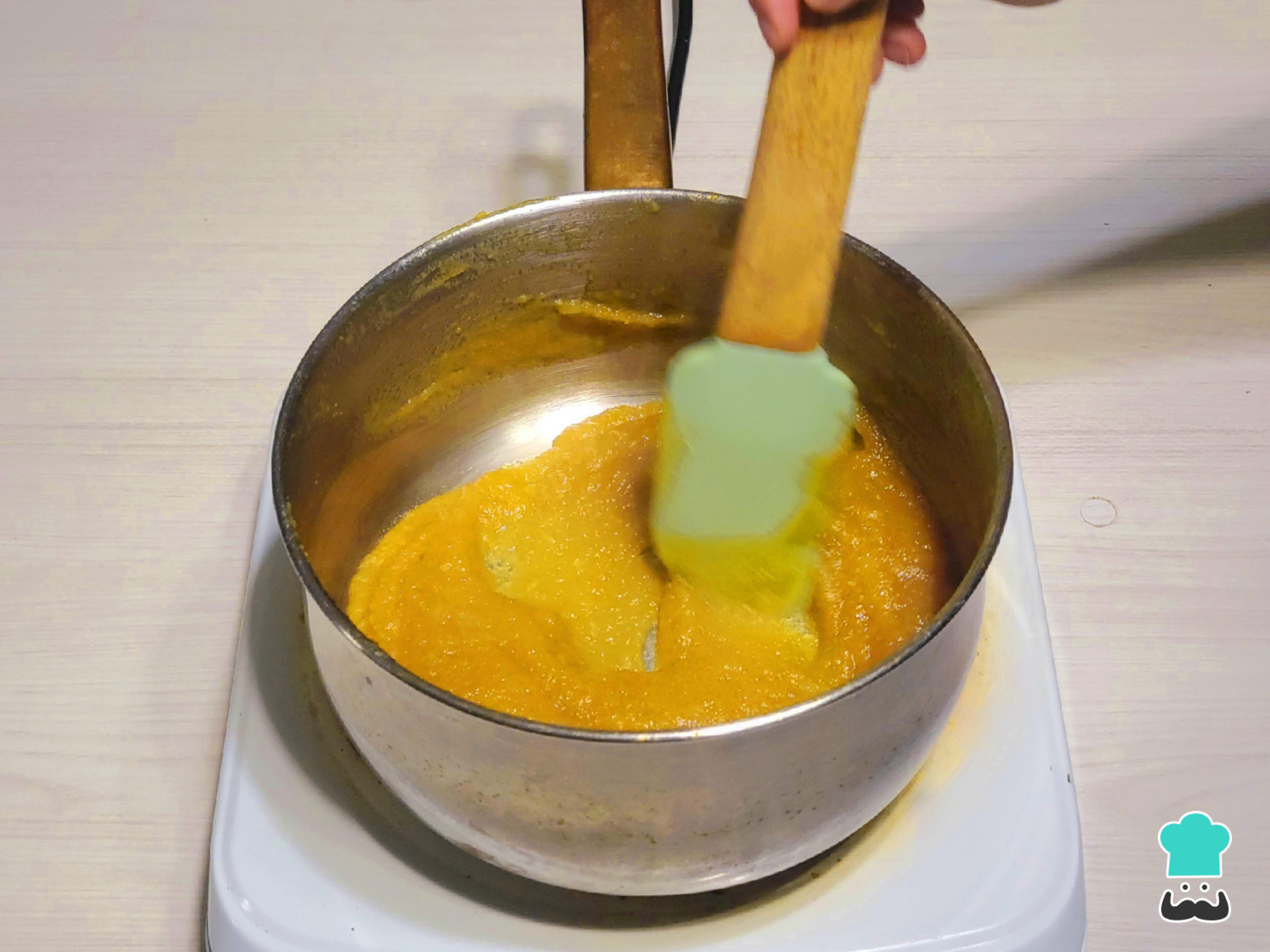 Retorna la mezcla al fuego bajo y remueve constantemente hasta que se forme una crema densa y, finalmente, una pasta. Puedes cambiar a una espátula de goma para facilitar el movimiento, sobre todo en los bordes. Cuando la pasta esté formada, retírala del fuego y deja enfriar.