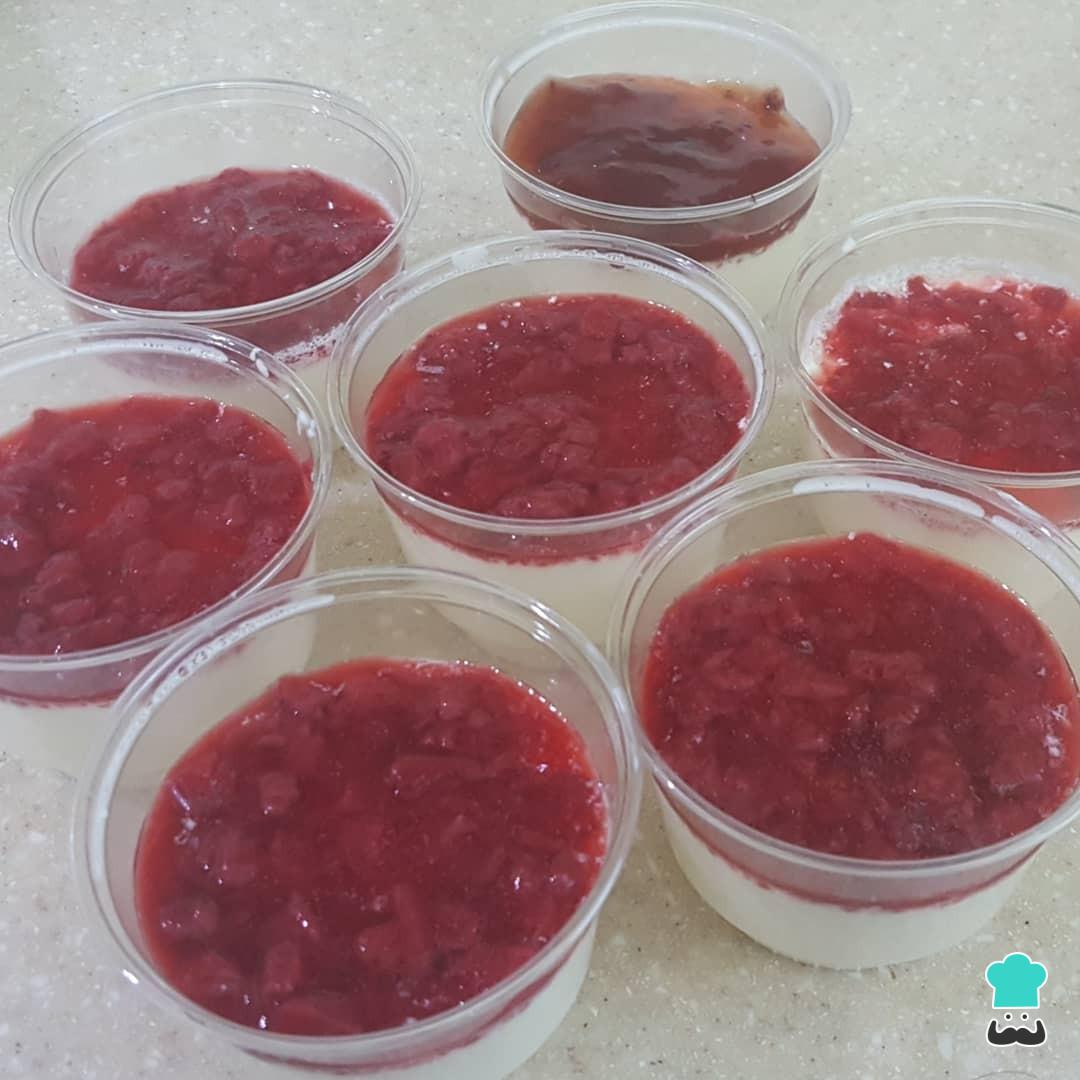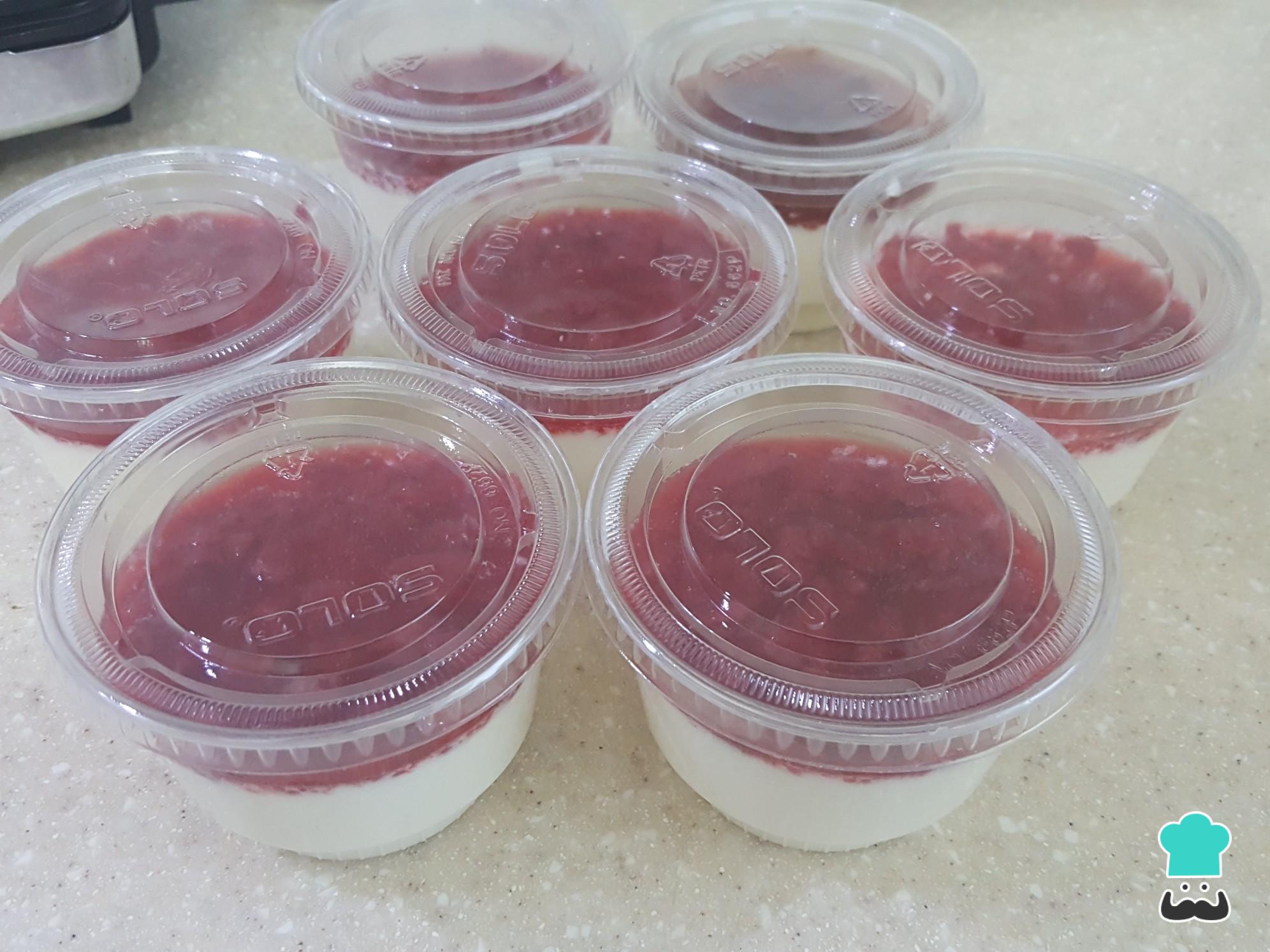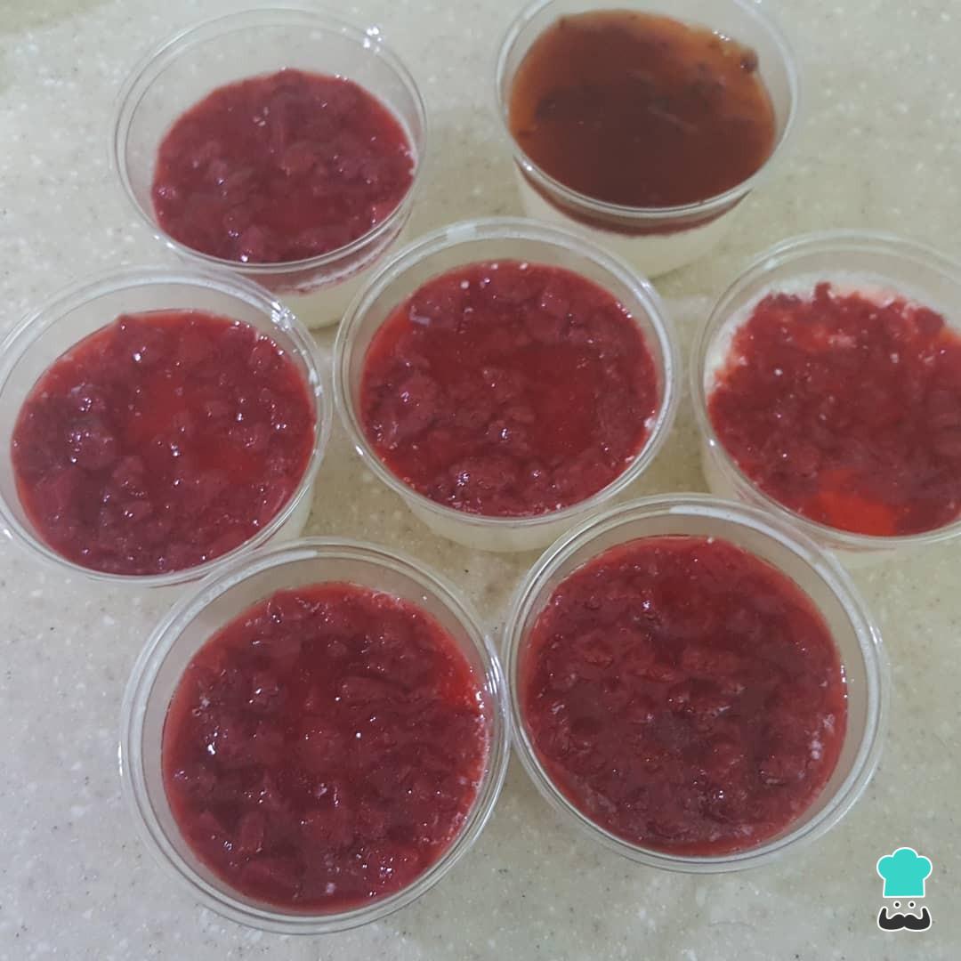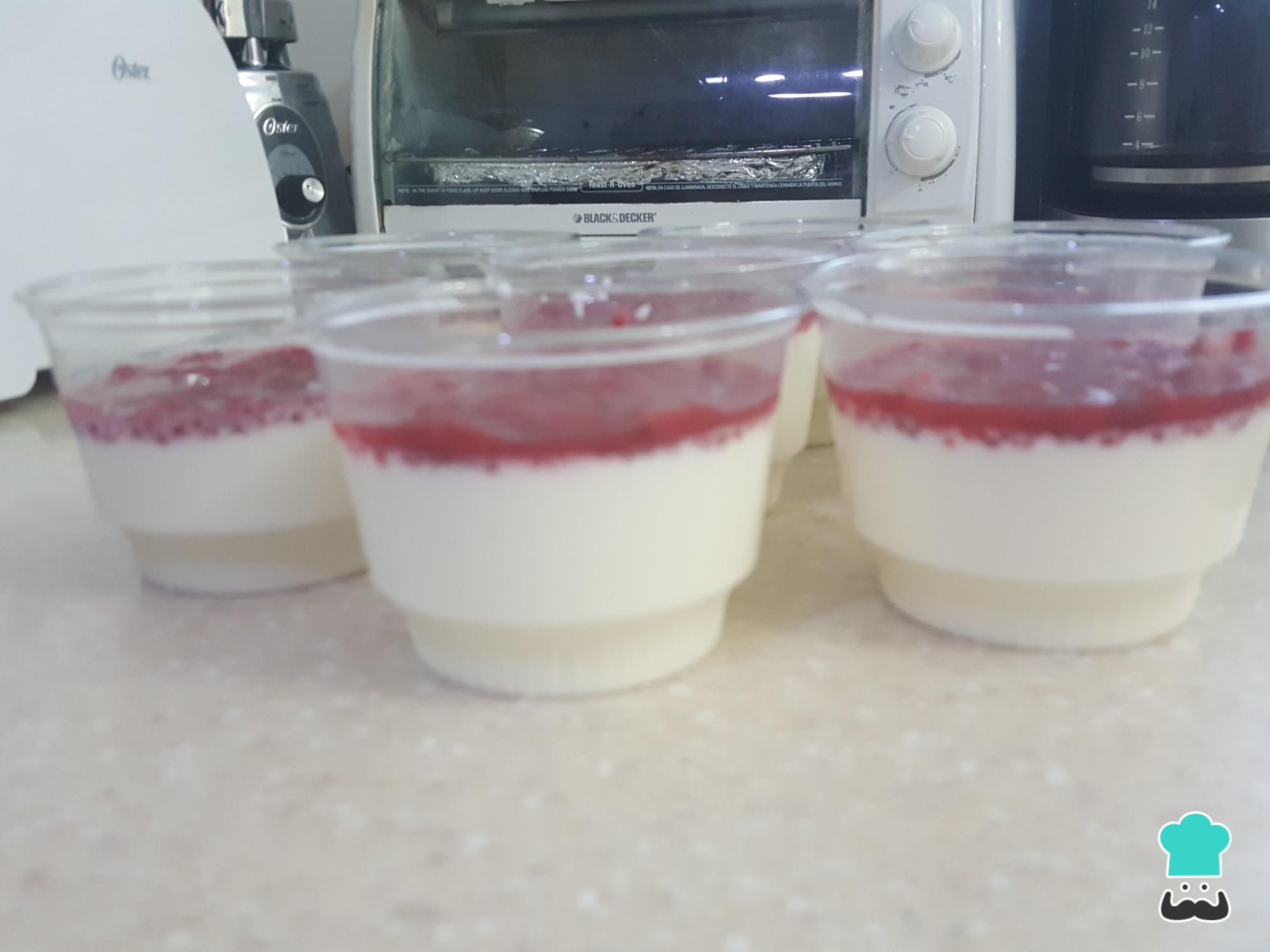 Cuando el yogur natural sin azúcar esté listo, los sacamos y disponemos para agregar el sirope de fresa.