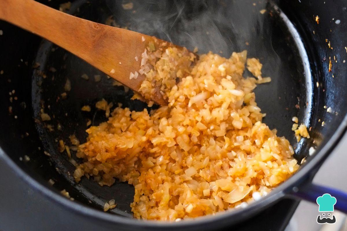 Continúa con la elaboración del sofrito tradicional, otra de las bases de la auténtica zarzuela de pescado catalana. En una olla, agrega un buen chorro de aceite de oliva virgen extra y sofríe la cebolla picada hasta que quede transparente. Después, agrega el ajo y, por último, el tomate rallado. La mezcla debe reducirse hasta obtener una textura espesa de un color rojo oscuro. En ese momento, podrás añadir la almendra molida, que actuará como espesante natural y que le aportará ese toque tostado tan característico de la zarzuela de pescado de la abuela. Reserva el sofrito.